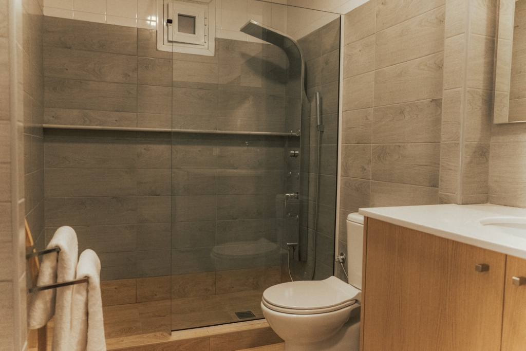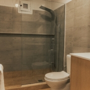 Room has a deluxe bathroom with shower and toilet.