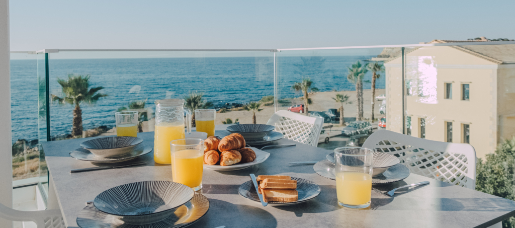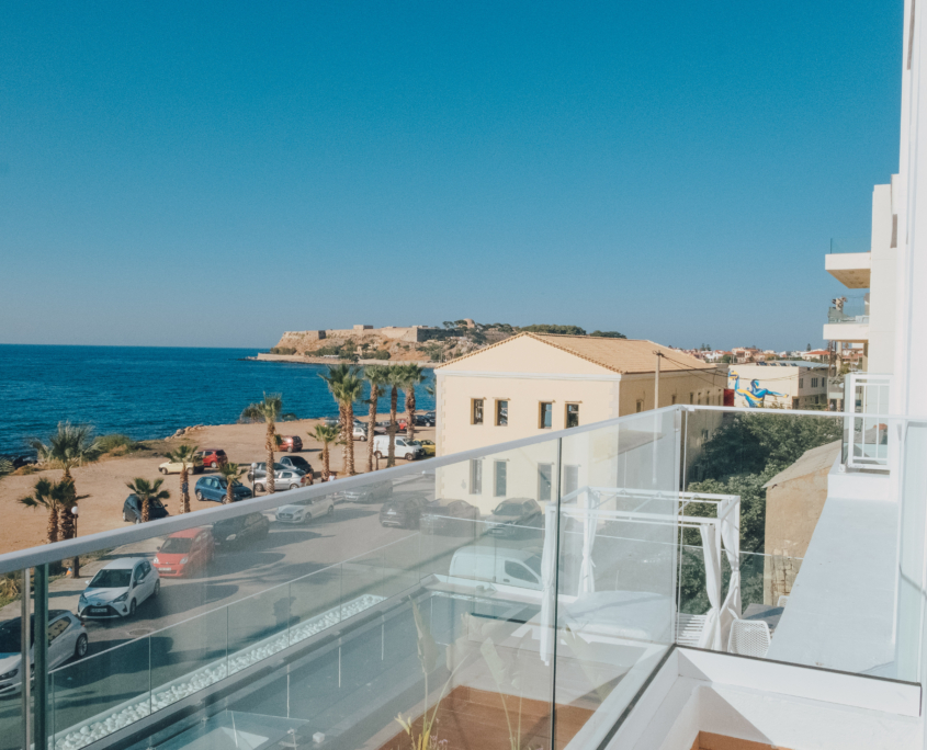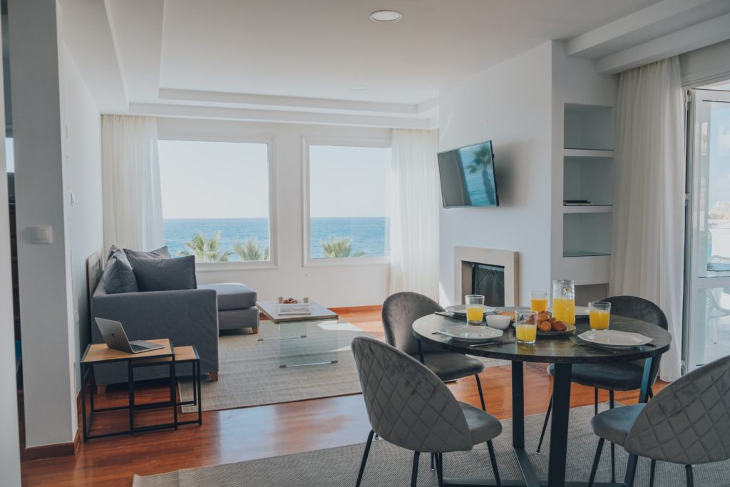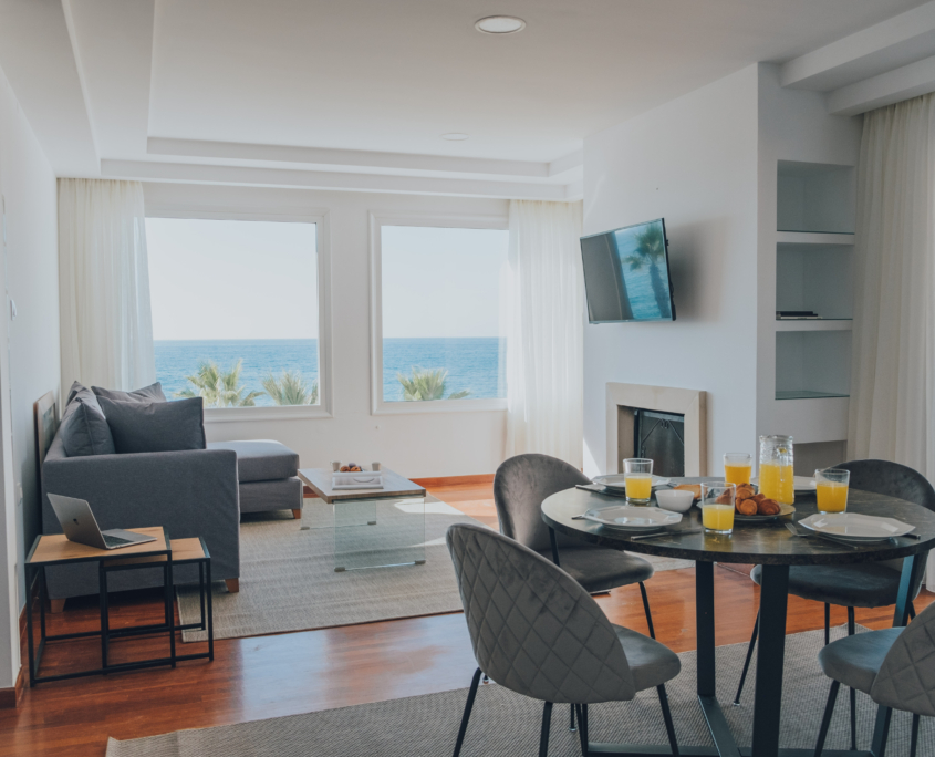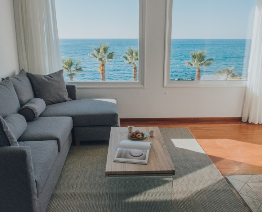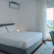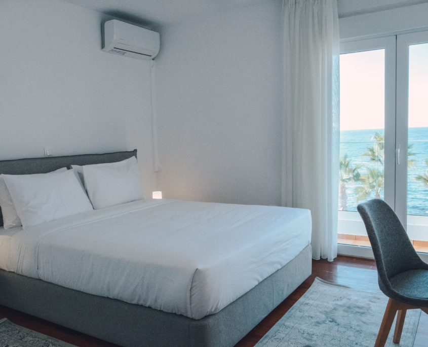 Our beautiful apartment has sea view from inside and also from its balconies. On the big balcony resides the jacuzzi where our guests can relax and enjoy the stunning sea view. Size of the apartment is 84m2. It has 2 bedrooms with a double bed each, a living room with an extra sofa bed, a kitchen and a beautiful bathroom.