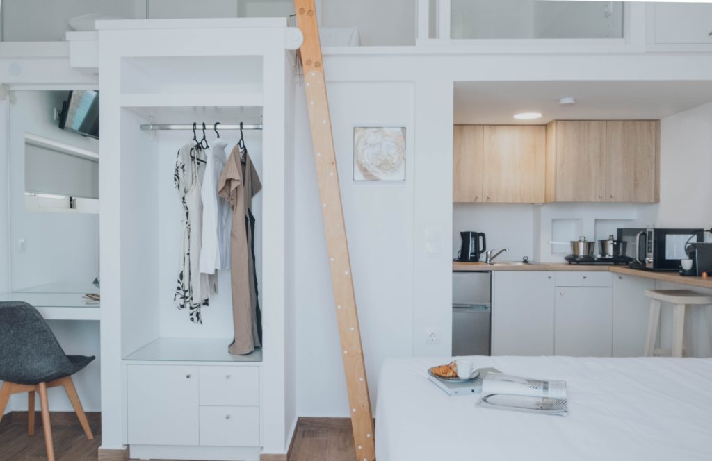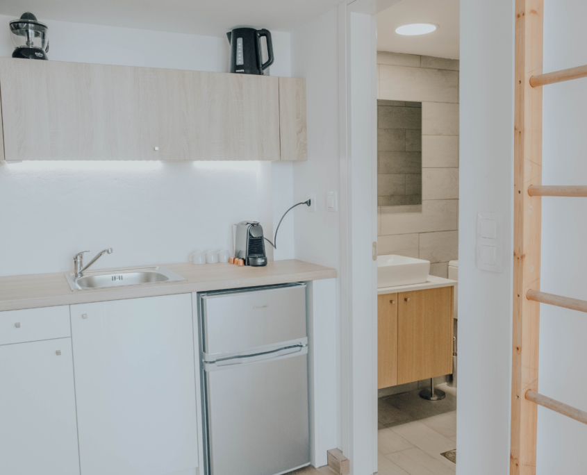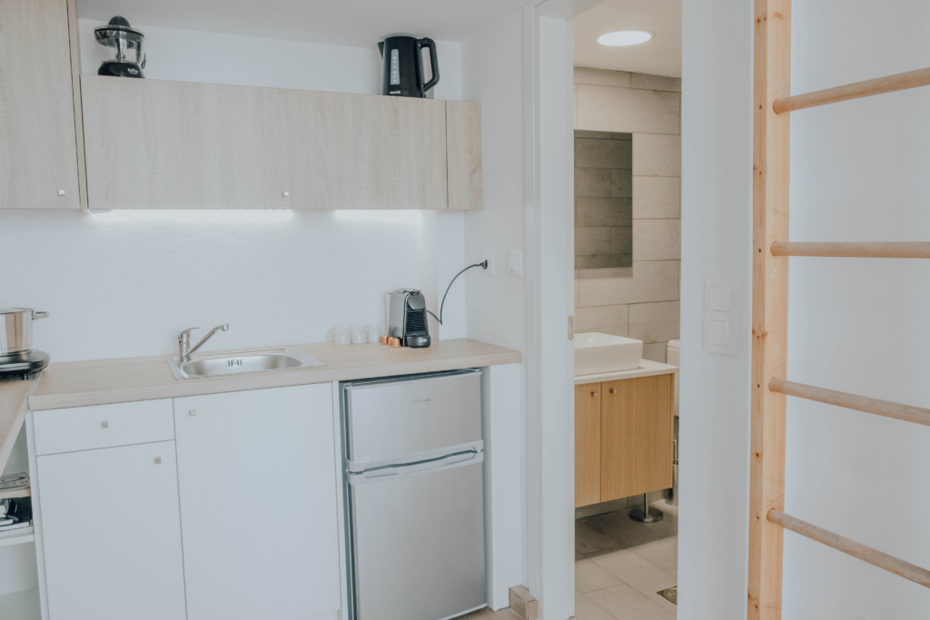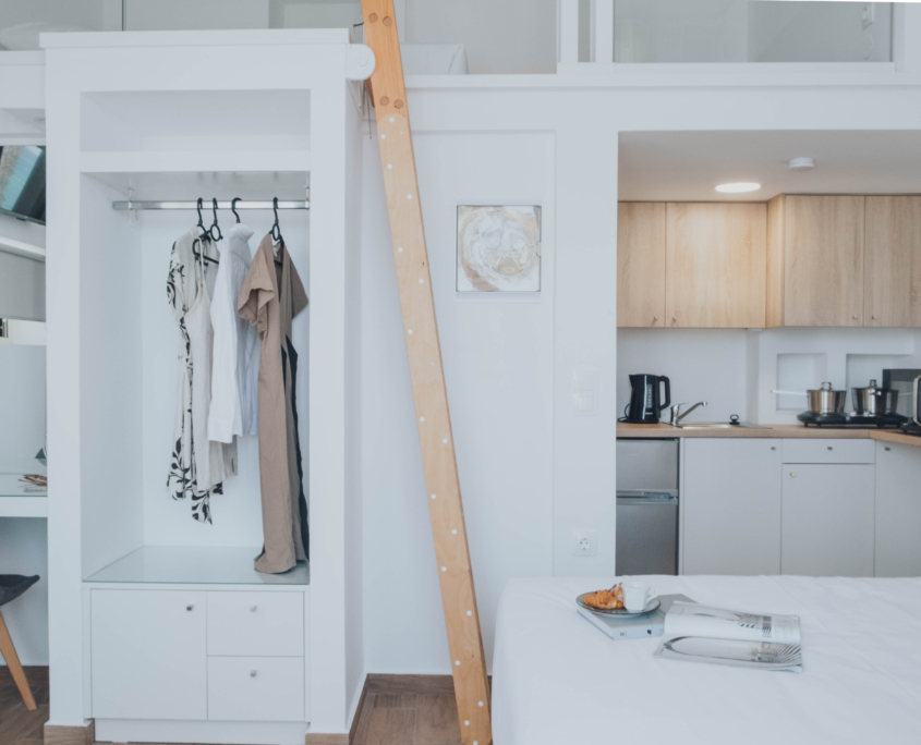 This small studio of 25m2 has everything you need. 1 luxury twin bed and 1 singe bed in the upper floor. Single bed has access through stairs. A private kitchenette. A private bathroom. Hall room to seat. Superior view to the sea and city.